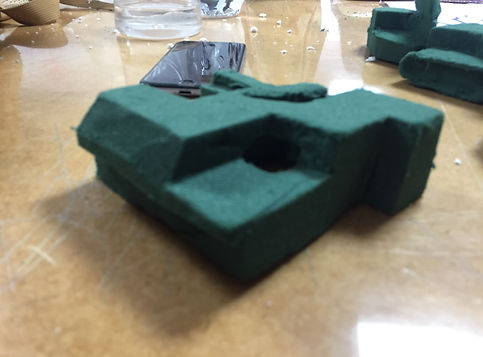 La primera intención de toma de partido, hecha en esponja floral debido a la facilidad de malear el material, dio la forma en la que se basarían casi todas las tomas de partida futuras. Una pieza central a la que se accede por una rampa que daría al área del parque, desembocando frente a la puerta principal. Lo importante era atraer a ala gente que se encontraba en el pasaje y en el parque. También se puede ver una superficie la cual esta al costado de una parte del proyecto en forma de punta, la cual pense que se podria dedicar a un comedor u otras actividades al aire libre.